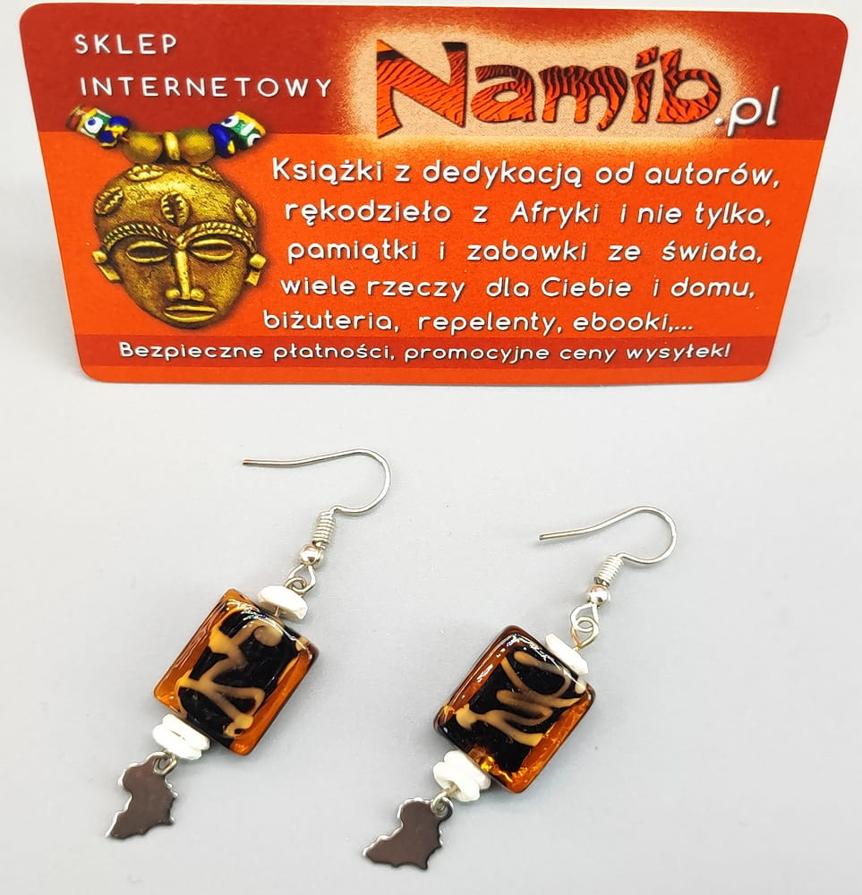 Piękne i oryginalne kolczyki z korali ze szkła, skorupek strusich jaj oraz zawieszek z Afryką.