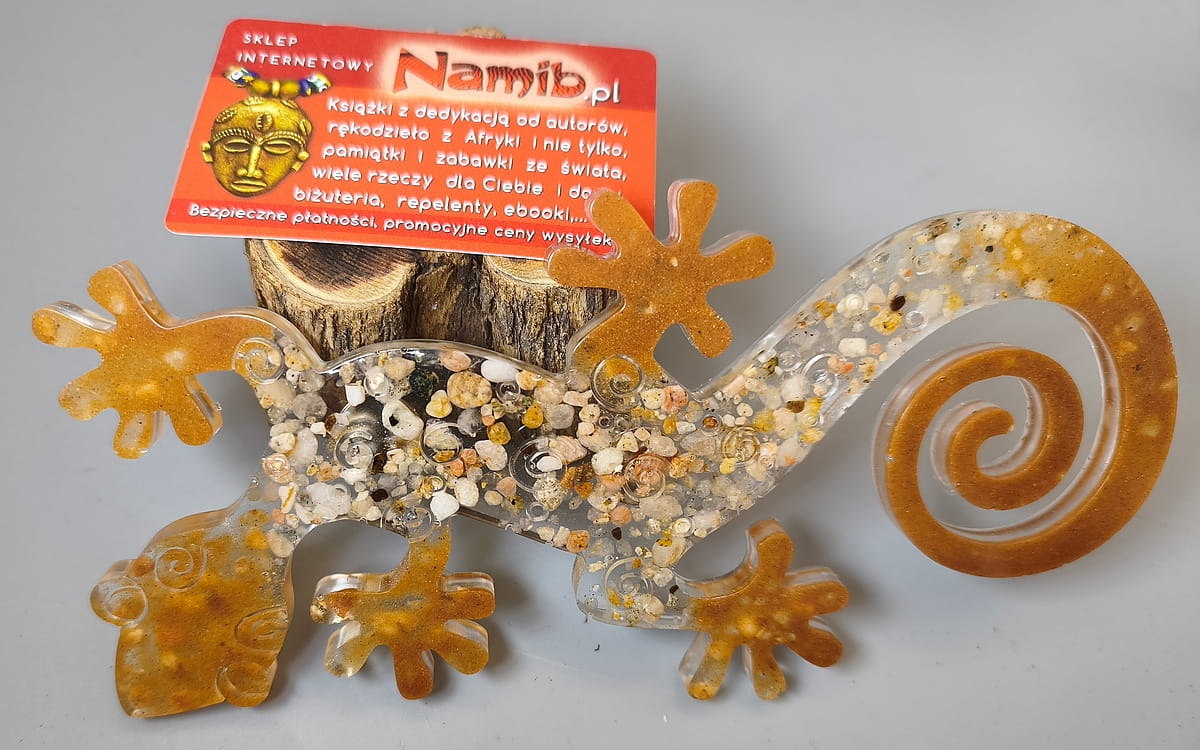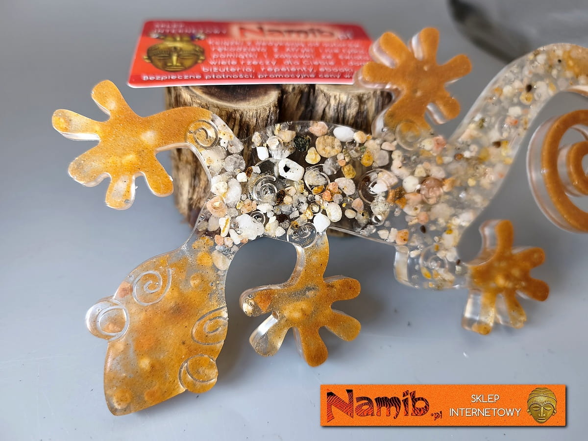 Magnes z żywicy z zalanym w niej żwirkiem z plaży Wybrzeża Szkieletowego w Namibii