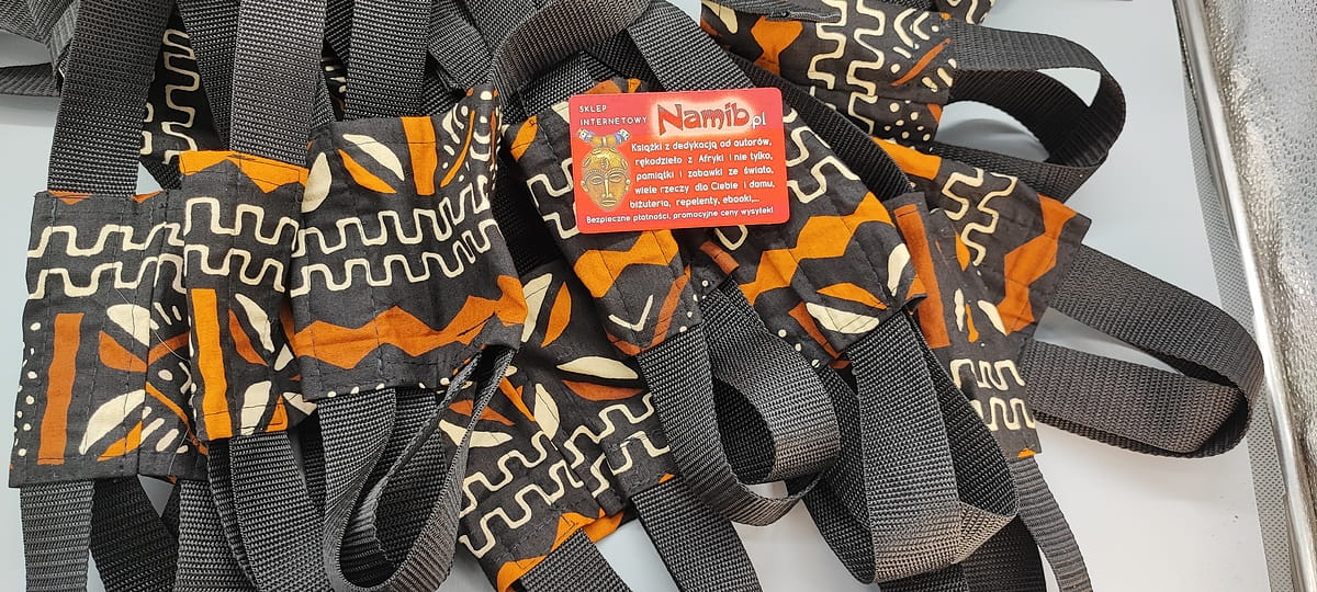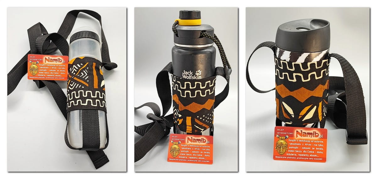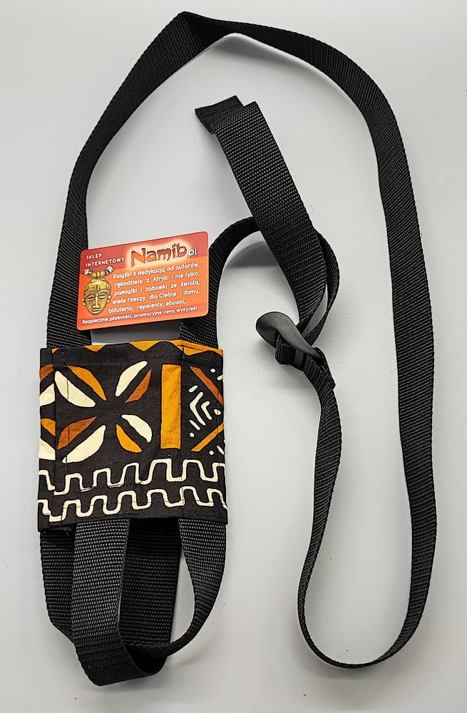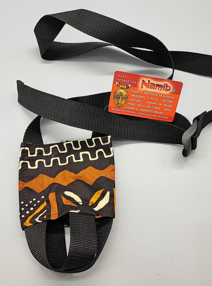 Nosidełko na bidon, butelkę z piciem. Pasek na ramię regulowany. Tkanina afrykańska, wzór zależny od fragmentu kuponu.
