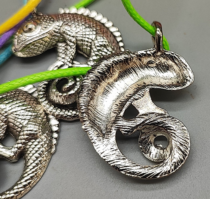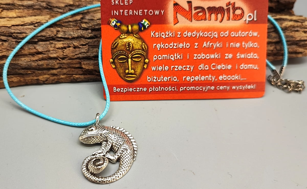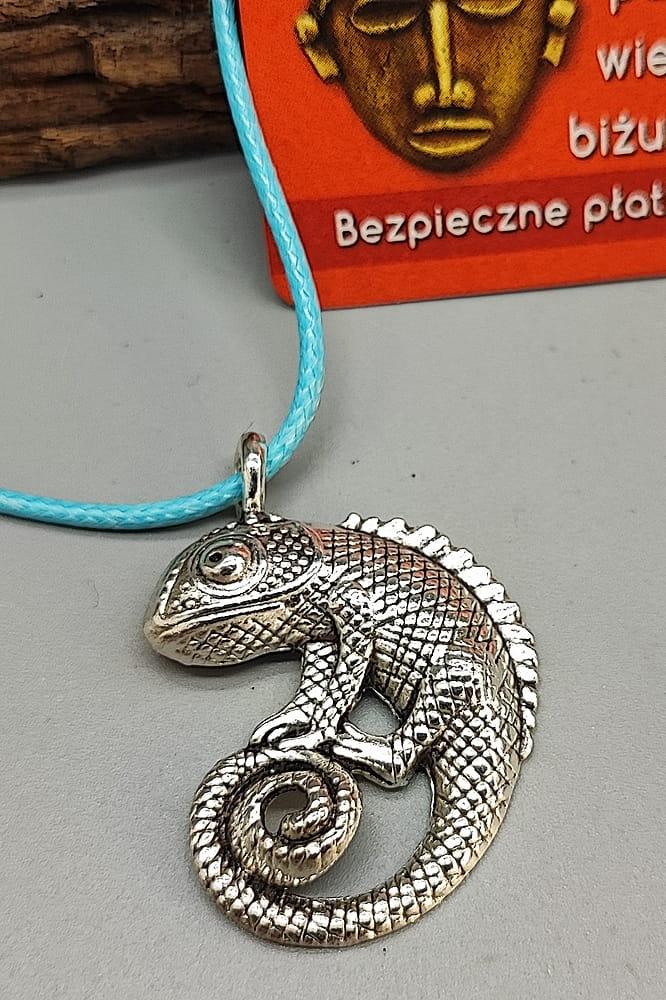 Naszyjnik z KAMELEONEM ze srebrzystego metali.
