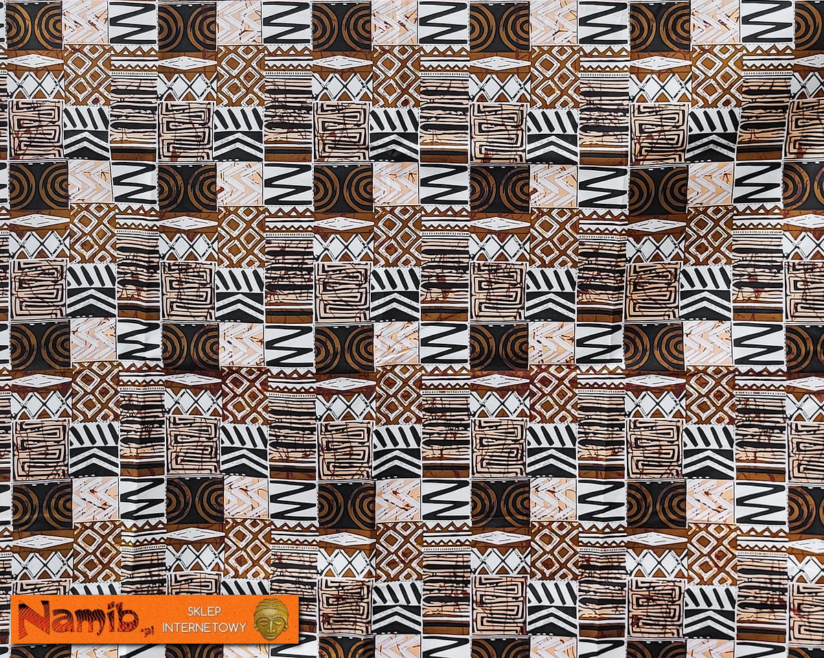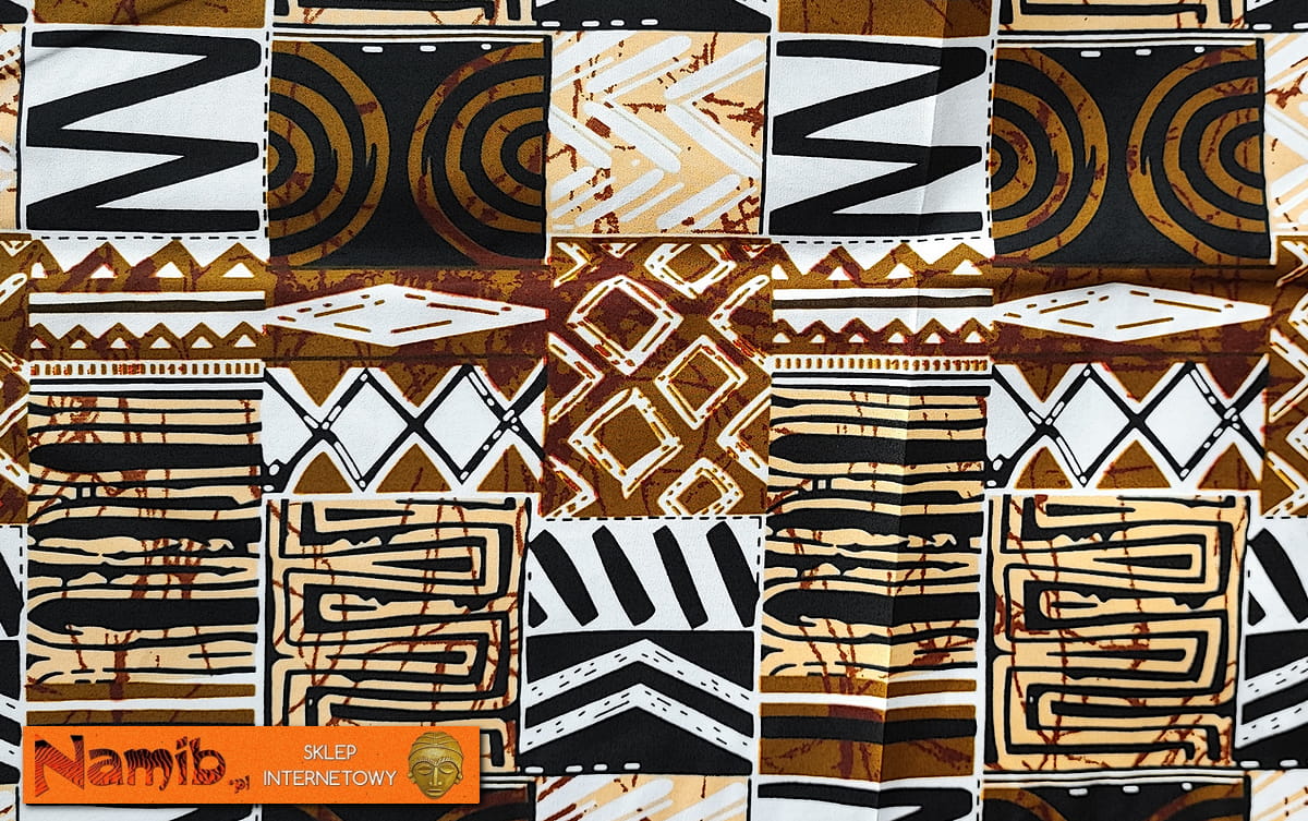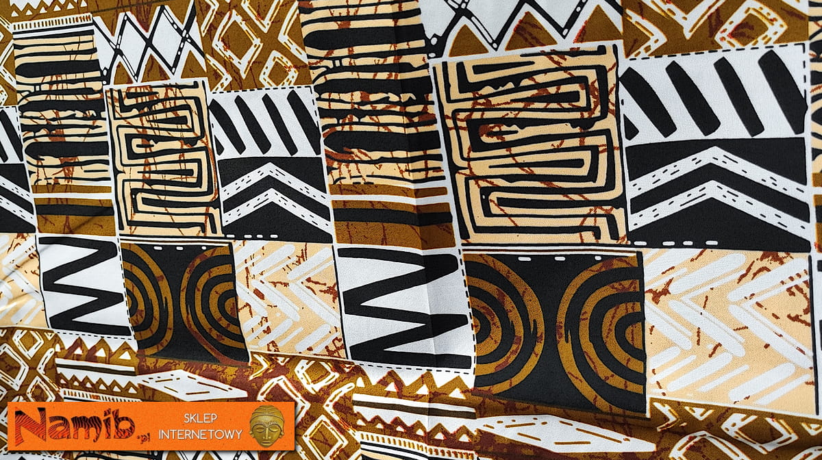 Zapraszamy do zakupu pięknego, egzotycznego materiału (bawełna + sztuczne włókna) o niepowtarzalnym wzorze, pochodzącego z Kenii. Materiał jest sztywny, gdyż został woskowany tradycyjną metodą. Po pierwszym przepraniu staje się mięciutki.
