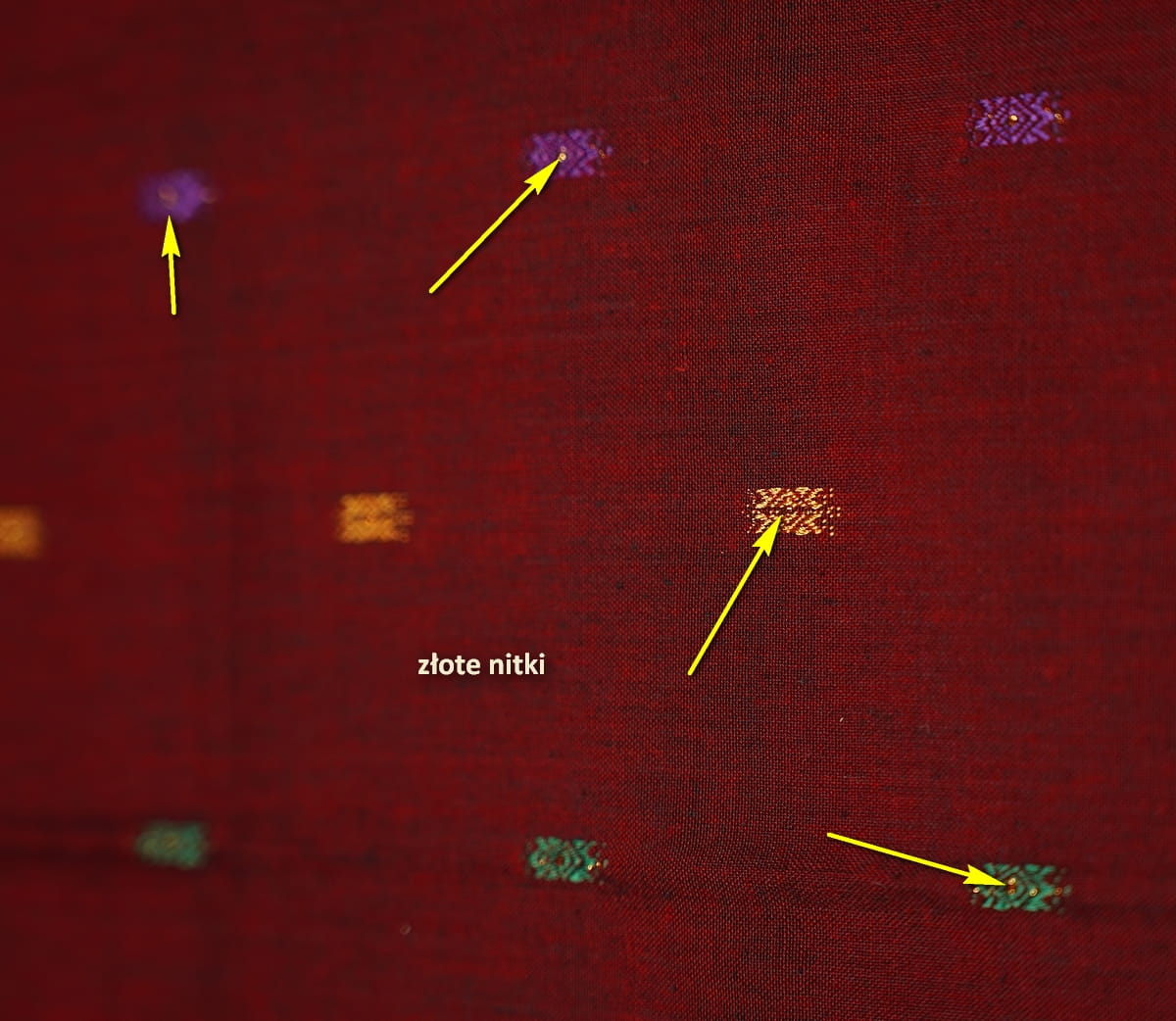 Materiał jest cienki, lekki, bordowy z eleganckim połyskiem i drobnymi wzorkami dodatkowo wzbogaconymi o złotą nitkę.