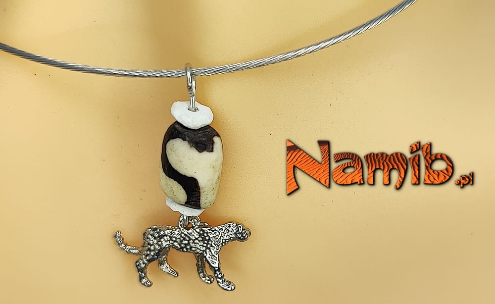 Stylowa i oryginalna biżuteria wykonana z korali z zawieszką z metalu w kształcie geparda.